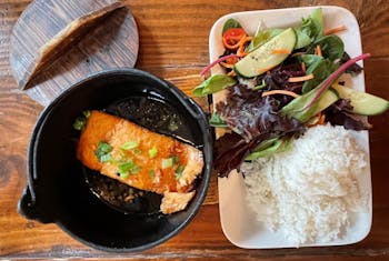 Incredibe food. Happy hour is the best time to come. Lots of sushi and the seafood pho rocks! You may see a fly or two on the patio but hey it's downtown. Stop on by!!